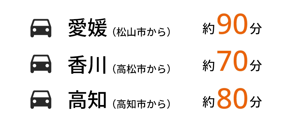三好市は四国のほぼ真ん中に位置しており、徳島・高知・高松・松山といった四国各県の県庁所在地までどこも約1時間30分内で行くことができます。大阪・神戸といった大都市にもJRや直通の高速バス(大阪まで約3時間50分)を利用して行くことができます。