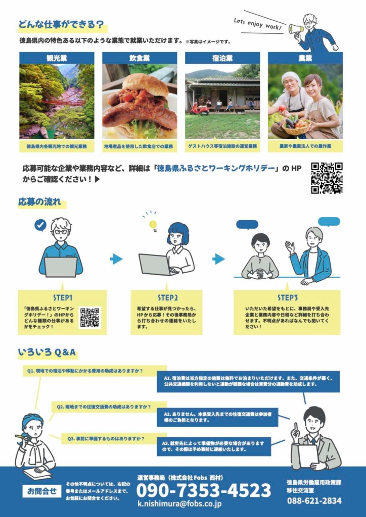 徳島県内で2週間から1ヶ月程度、地元企業で働き収入を得ながら、地域の方や地域おこし協力隊と交流したり地域イベントへ参加するなど徳島県を丸ごと体感して頂く取り組みです。